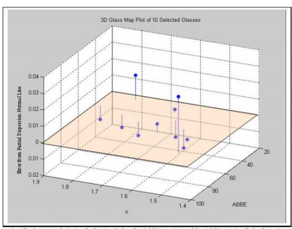 如圖8所示,是一個(gè)三維圖,其既包括傳統(tǒng)的玻璃圖也包括部分色散偏離正常直線的差值。這里的玻璃有?BK7,PSK53,KZFSN4,F(xiàn)K54和?SF6。這張表可以讓我們同時(shí)找到折射率、阿貝數(shù)以及部分色散;可以讓我們更快地選擇合適的玻璃。