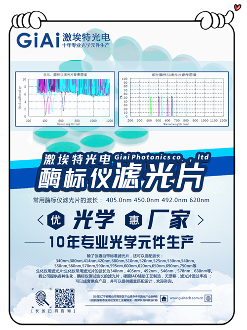 酶標(biāo)儀用濾光片:?IAD硬膜構(gòu)成,無漂移,可靠耐用。多種規(guī)格、尺寸適用于國內(nèi)外各知名品牌酶標(biāo)儀。